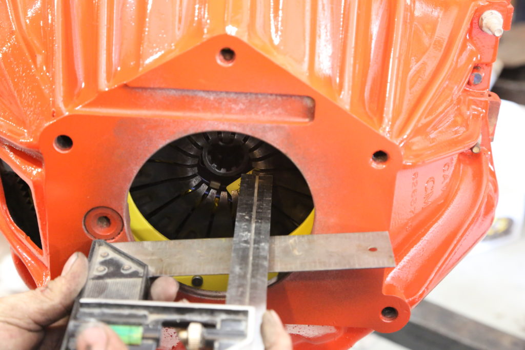 To start the process, the engine must be assembled with the flywheel and pressure plate. The clutch does not have to be installed at this point, because it doesn’t matter; but if you want to do everything at once, install the clutch with an alignment tool in place. Additionally, the bellhousing must be installed on the engine as well. Begin by placing the straight edge across the center of the opening in the bell housing. Use a ruler or measuring tape to determine the resting depth of the diaphragm, this measurement is taken off of the fingers themselves where the release bearing rides. Take this measurement in three places and write the results down on the scratch paper.