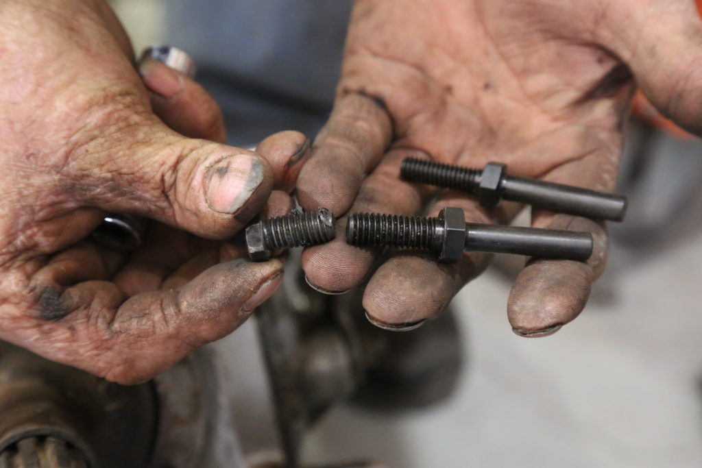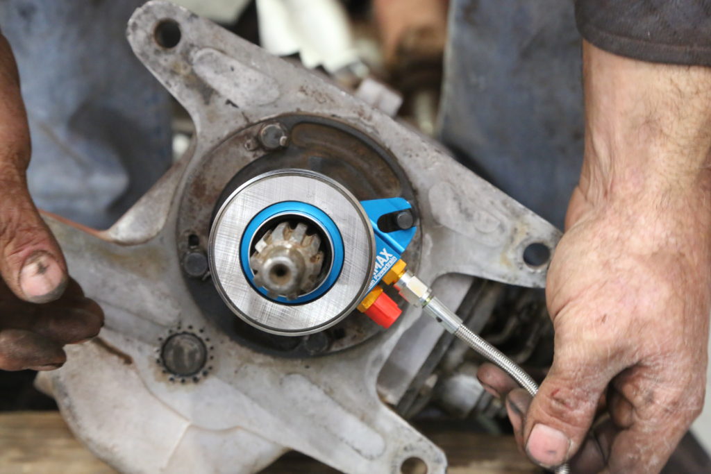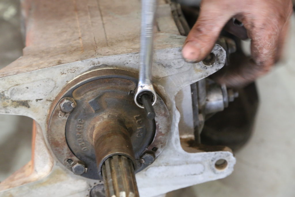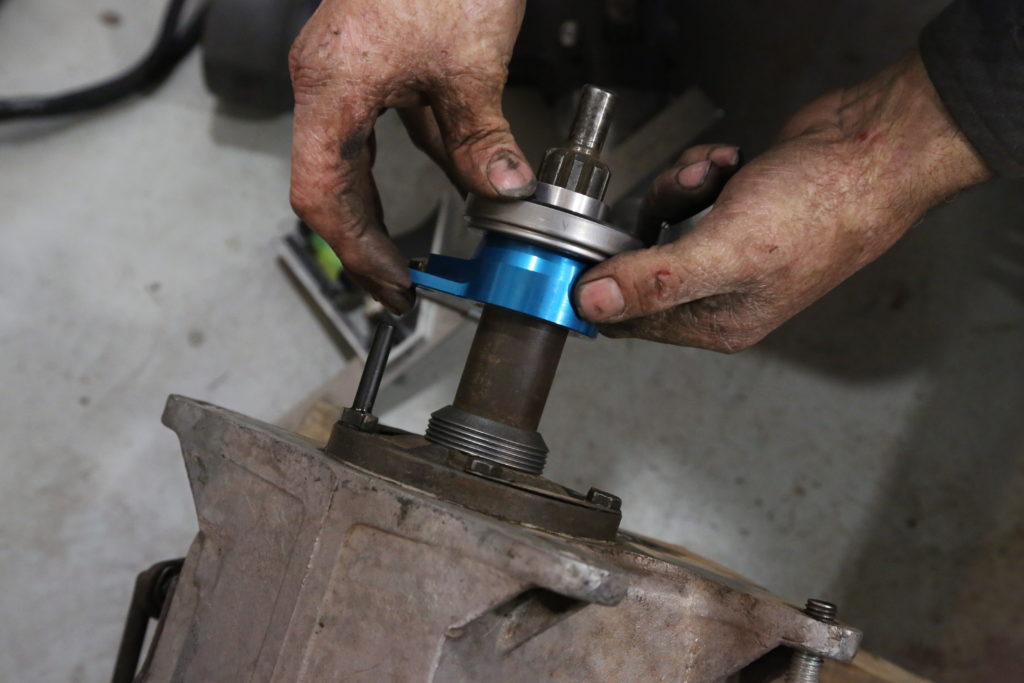 Then the stud is installed into the transmission. Don’t forget to use medium threadlocker on the threads and bend the retaining tabs back over the hex on the stud.