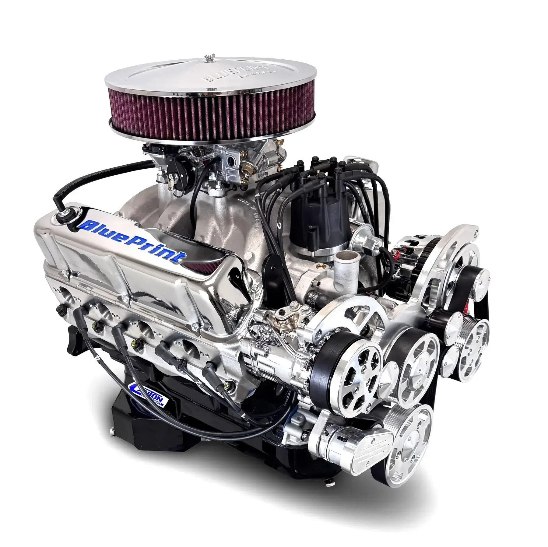 Description: Horsepower & Torque: 541 Horsepower / 519 FT LBS Compression Ratio: 10.0:1 Aluminum Heads Hydraulic Roller Cam Forged Crank Forged Pistons Block: NEW BluePrint Engines’ High Strength Cast Iron Block 4-Bolt Main 1-Piece Rear Main Seal Rotating Assembly: New Forged Crankshaft 4.000″ Stroke Forged 6.2″ Connecting Rods Forged Pistons Internal Engine Balance Cylinder Heads: Aluminum Cylinder Heads 2.08″ Intake/1.60″ Exhaust Valves 205cc Intake/70cc Exhaust Runners Cam Specs: Cam Type: Roller .608 Intake .608 Exhaust 248 Intake / 258 Exhaust duration @ .050 – 114-degree lobe separation Also Includes: 870cfm Carburetor Single Plane Intake Manifold Pro Series Distributor Valve Covers, Oil Pan and Timing Cover Harmonic Balancer Spark Plugs Polished Front Accessory Drive – BPP302FDACPS4 Driver Side Standard Rotation Water Pump Type II Power Steering Pump Remote Power Steering Pump Reservoir 140amp 1-wire Alternator 7B10 Peanut Air Conditioning Compressor Notes: Engine timing cover is designed for standard rotation water pump ONLY. The Front Accessory Drive on this engine fits many vehicles, however it is the customer responsibility to accurately measure and confirm fitment. Note this is a low-profile design, but things such as power steering hoses, alternator wiring, and additional fittings/fabrication may be required on some vehicles.
