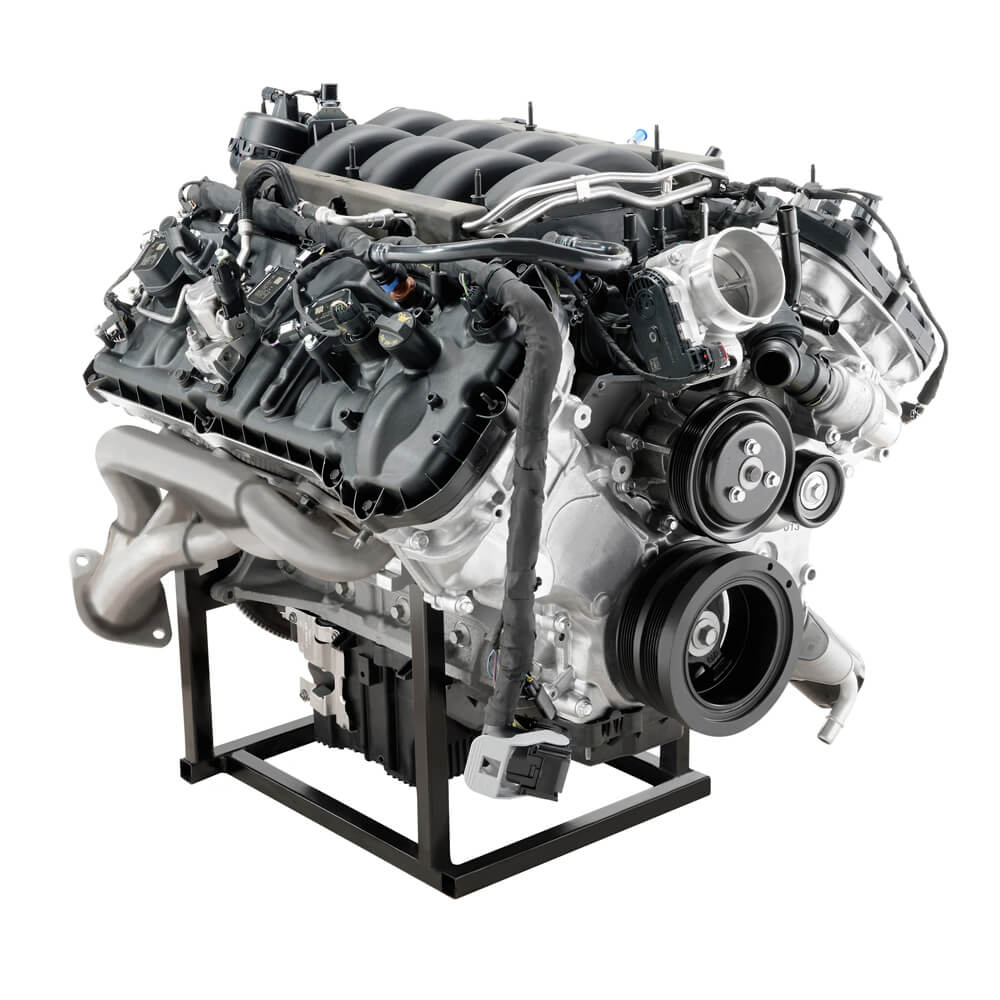 The single 80 mm “drive-by-wire” throttle body and composite lightweight intake manifold enhance efficiency and responsiveness. Equipped with a 9.5-quart steel oil pan and a Mustang GT 409 stainless steel exhaust manifold (right side only), this engine is designed for robust performance. Engine mount bosses and bell housing mount patterns are consistent with 5.0L modular engines, ensuring compatibility and ease of installation.
