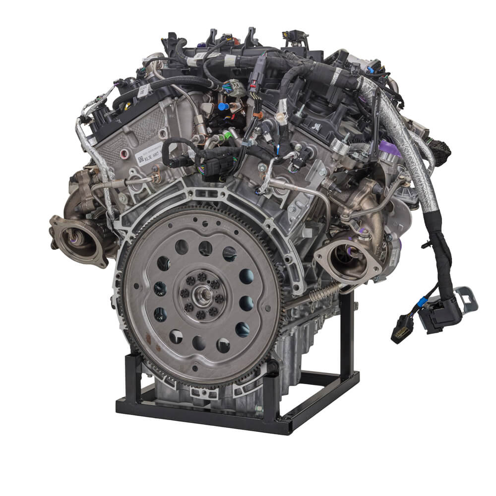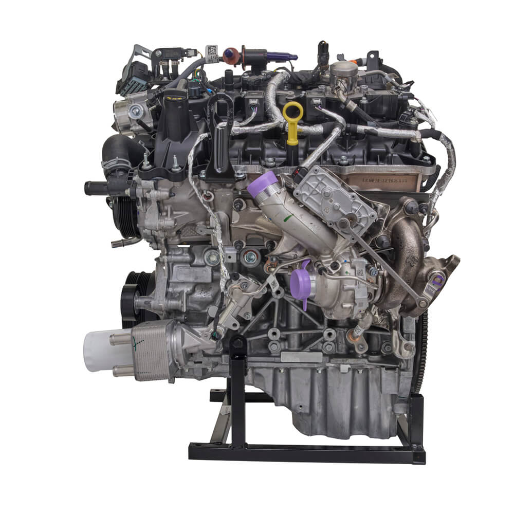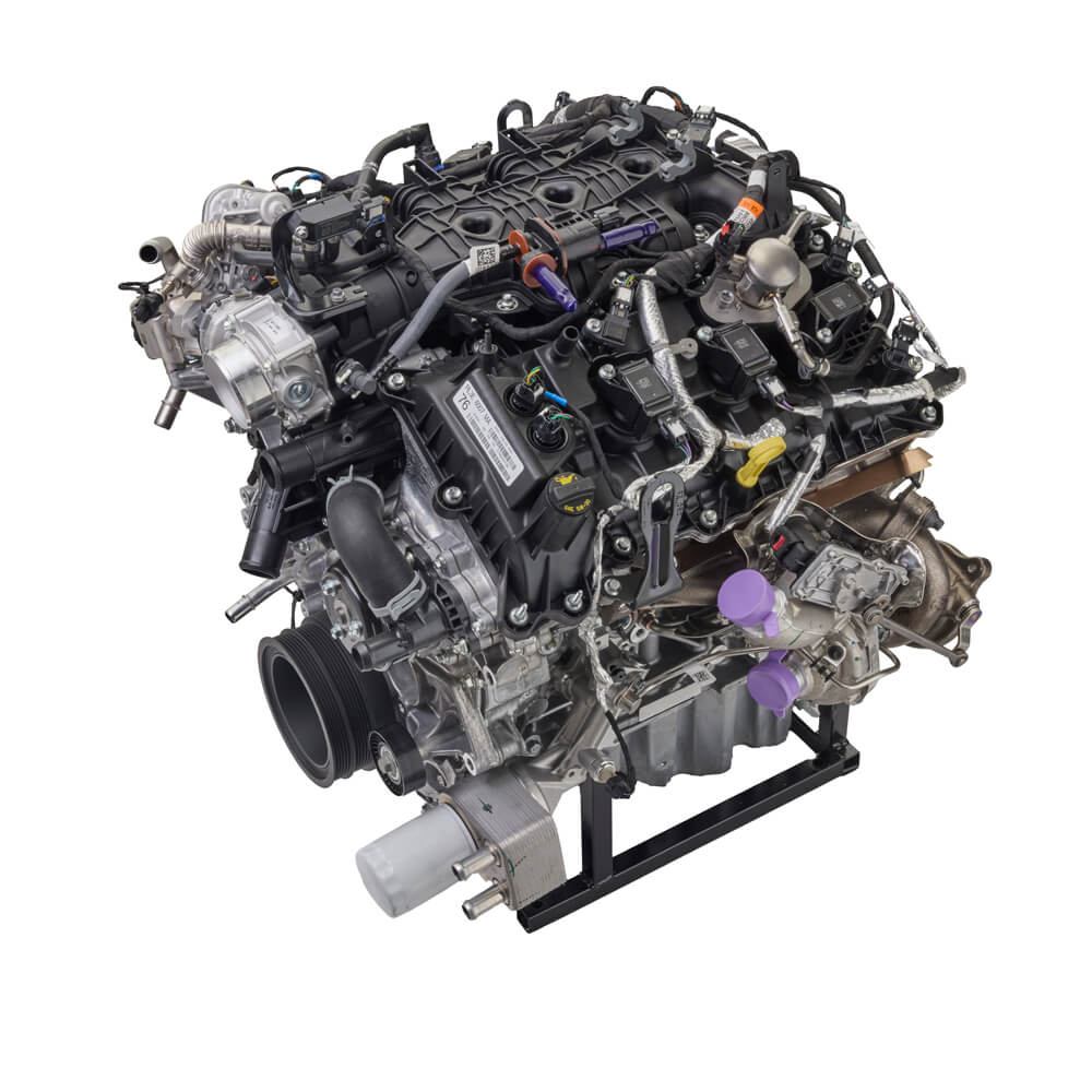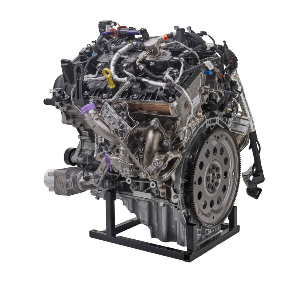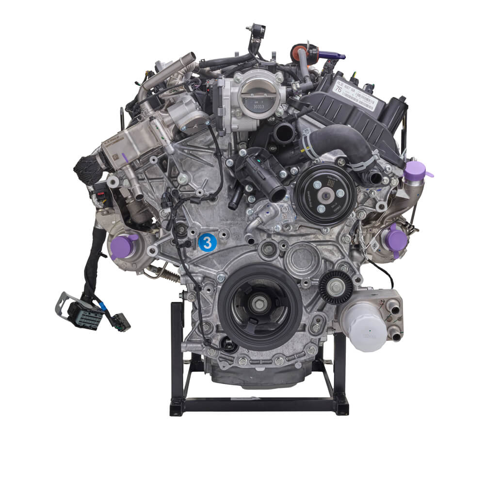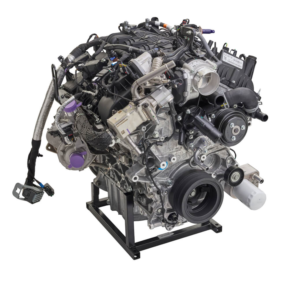 This Twin Turbo crate engine delivers 450 horsepower at 5,520 RPM and 510 ft-lbs. of torque at 3,250 RPM. It’s ideal for custom builds and street rods, especially when combined with a separate control pack. This engine (M-6007-35TA) uses twin independent variable cam timing (Ti-VCT), direct injection, and turbocharging.