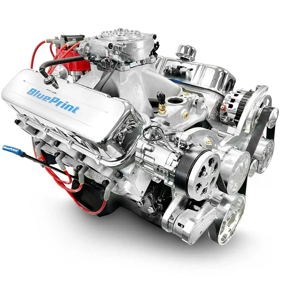 Description Description: Horsepower & Torque: 600 Horsepower / 568 ft. lbs. Torque Compression Ratio: 10.1:1 BluePrint Engines Aluminum Heads BluePrint Engines Hydraulic Roller Cam BluePrint Engines Forged Crank BluePrint Engines Hypereutectic Pistons Block: BluePrint Engines High Strength Cast Iron Block, 454 BBC Manufactured and Machined in the USA! Mech Fuel Pump Provision: Yes 1-Piece Rear Main Seal Standard Deck 4-Bolt Main 4.310″ Bore Rotating Assembly: BluePrint Forged Steel Crankshaft 4.250″ Stroke 6.135″ Connecting Rods w/ 150,000 PSI Bolts Hypereutectic Pistons Externally Balanced Front and Rear Cylinder Heads: BluePrint Aluminum Cylinder Heads – PS8013 119cc Chamber 2.30″ Intake / 1.88″ Exhaust Valves 316cc Intake / 124cc Exhaust Runners Cylinder Heads Feature a .300 in. Raised Exhaust Port vs an OEM Casting. Must Verify Header / Exhaust Clearance Cam Specs: Hydraulic Roller .647 Intake / .647 Exhaust Lift 248 Intake / 254 Exhaust Duration @ .050-112 Degree Lobe Separation Ignition Timing: 10-16° Initial and Total Timing 32-34° at 3500 RPM Also Includes: Intake Manifold Single Plane, Satin Aluminum – BPP454540INT Holley Sniper 2 EFI System – BPP550-510-3XX HEI Ready Run Distributor – BPP350RBK Timing Cover Valve Covers Oil Pan Polished Pulley Kit – BPP454FDPSAC4 Reverse Rotation Short Water Pump 1- Wire 140amp Alternator Peanut Style Air Conditioning Compressor Type II Power Steering Pump with Remote Reservoir Notes: Not for EGR Features External 42.5 oz. imbalance. Recommend BluePrint Engines flywheel 14096987 , or BluePrint Engines flex plate 399973 . The front accessory drive on this engine fits many vehicles, however it is the customer responsibility to accurately measure and confirm fitment. Note this is a low-profile design, but things such as power steering hoses, alternator wiring, and additional fittings/fabrication may be required on some vehicles.