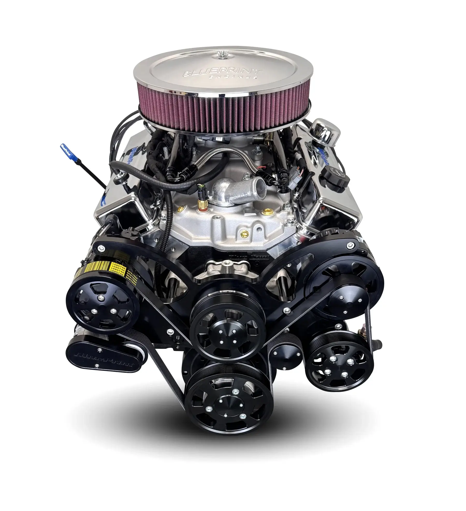 The BluePrint 400 Small Block Chevy compatible performance crate engines are dyno tested at our factory with guaranteed power levels of 500 horsepower and 500 ft. lbs. of torque. The BluePrint designed, multi-port fuel injection system, complete with ECU and full Wiring Harness, has had extensive calibration and development work in creating this specifically tuned and optimized engine that goes well beyond the performance of self-learn EFI systems on the market today. This BluePrint ECU is designed for hassle-free start up and operation. The ECU controls ignition timing and fuel and installs with 3 simple wired connections (Main Battery, Switched 12V Ignition Wire and Fuel Pump).