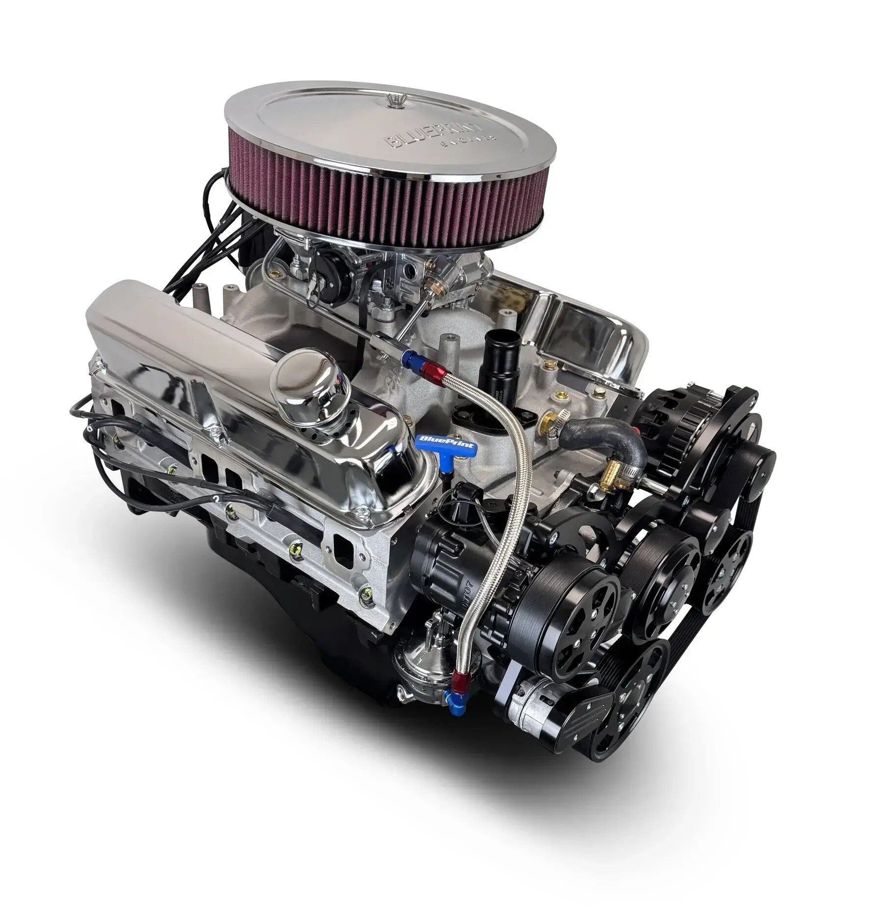 BluePrint’s BPC4085CTCKB Chrysler Small Block Compatible performance crate engines are dyno tested. This produces 465 horsepower and 494 ft. lbs. torque. This 408ci Stroker Engine comes with Spark Plugs, Spark Plug Wires, Dipstick, Oil Pan, Timing Cover, Valve Covers, Edelbrock Aluminum Heads, Magnum Pattern Intake, Holley Classic 750cfm Vacuum Secondary Carburetor w/ Electric Choke, BluePrint Premium Air Cleaner, and Black Pulley Kit.