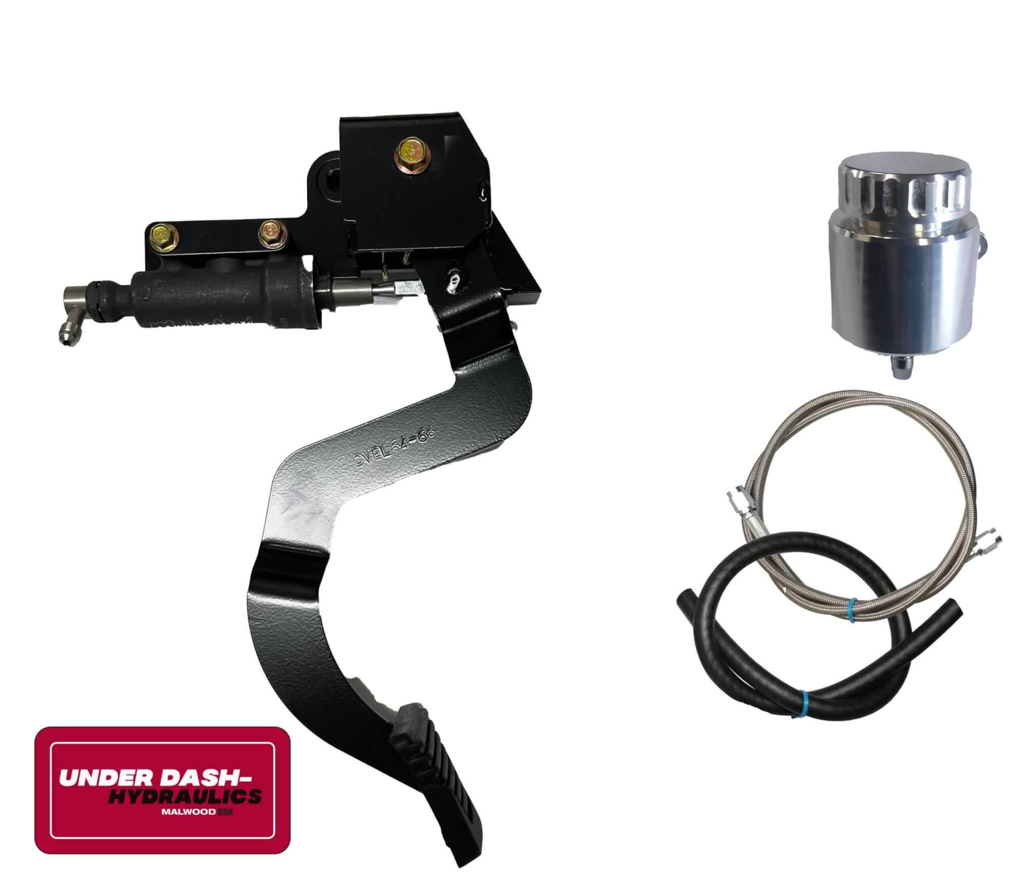 Underdash Hydraulics Clutch Conversion kit for Chevy Chevelle 1964-66. Completely bolt in kit with integrated master cylinder that mounts under the dash. Takes all the guesswork out of mounting and pedal rod ratio. Pedal kit only. Works with most hydraulic release bearings.