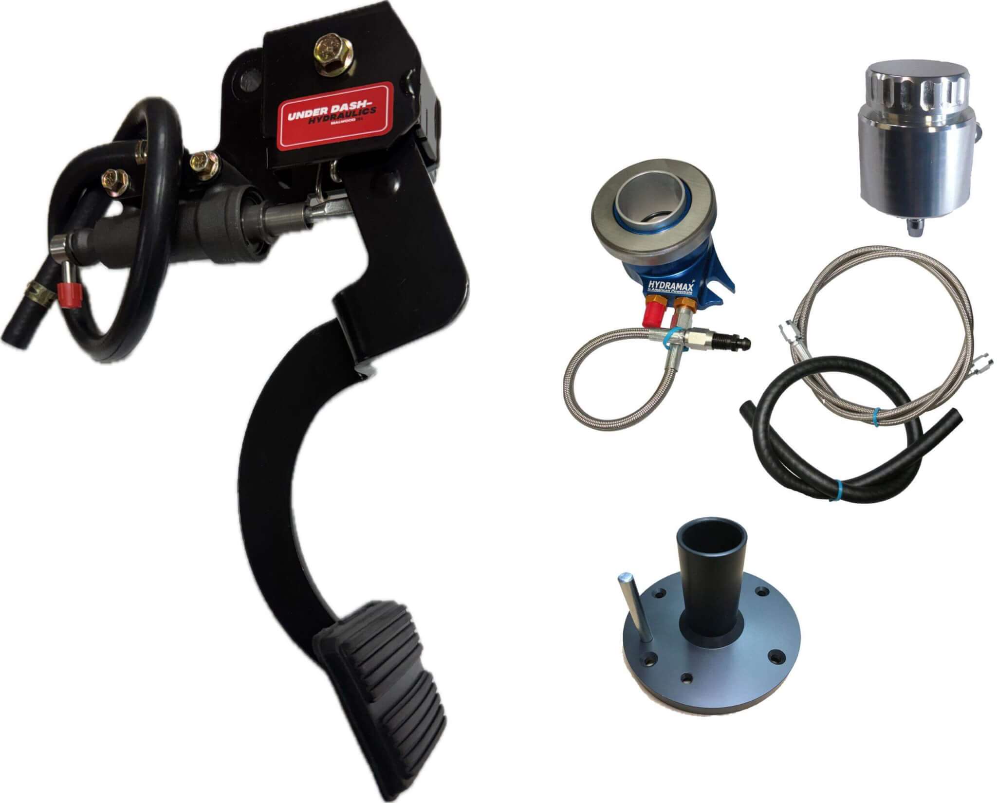 Underdash Hydraulics Clutch Conversion kit for GM A-body BOP Cars 1966. Completely bolt in kit with integrated master cylinder that mounts under the dash. Takes all the guesswork out of mounting and pedal rod ratio.