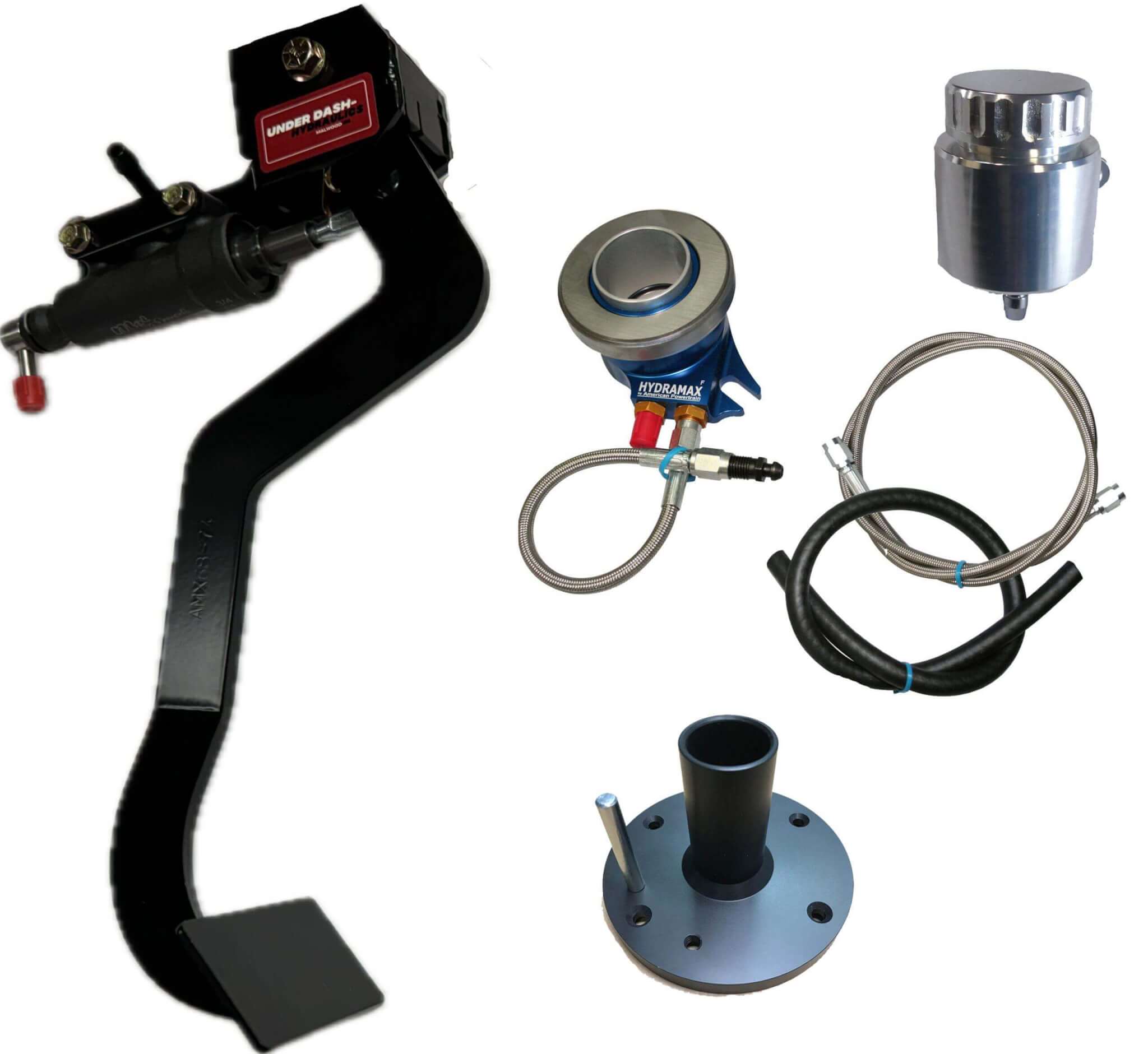 Underdash Hydraulic Clutch Conversion kit for 1968-74 AMC AMX Complete bolt in kit with Malwood integrated master cylinder that mounts under the dash. Takes all the guesswork out of mounting and pedal rod ratio. Comes with our Hydramax billet release bearing kit for GM Magnum 6-speeds
