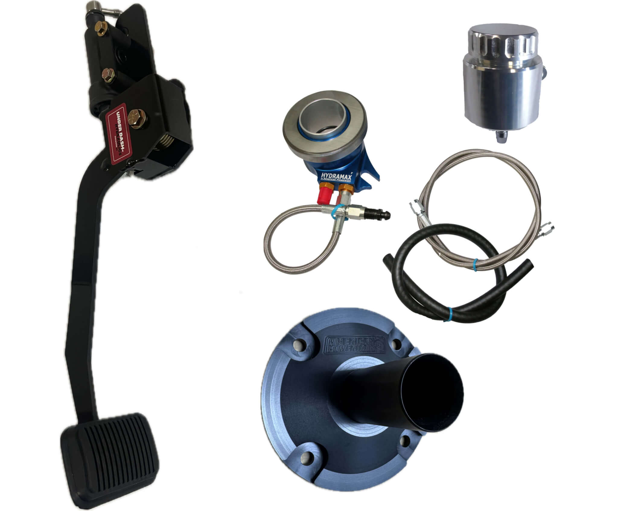 Underdash Hydraulics Clutch Conversion kit for 1969-70 Ford Mustang with manual brake. Completely bolt in kit with integrated master cylinder that mounts under the dash. Takes all the guesswork out of mounting and pedal rod ratio. Comes with our Hydramax billet release bearing.