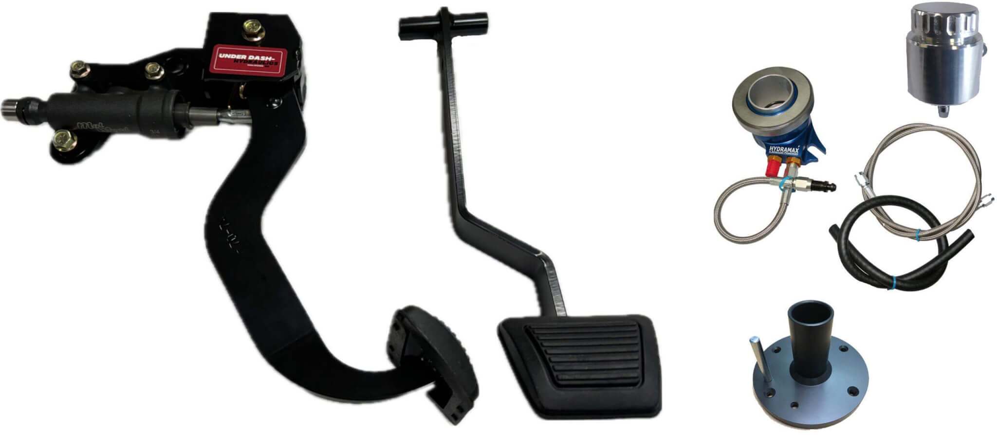 Underdash Hydraulic Clutch Conversion kit for 1970-74 Mopar E-body (Challenger,Cuda). Completely bolt in kit with integrated master cylinder that mounts under the dash. Takes all the guesswork out of mounting and pedal rod ratio. Comes with our Hydramax billet release bearing kit for all Tremec 6-speeds