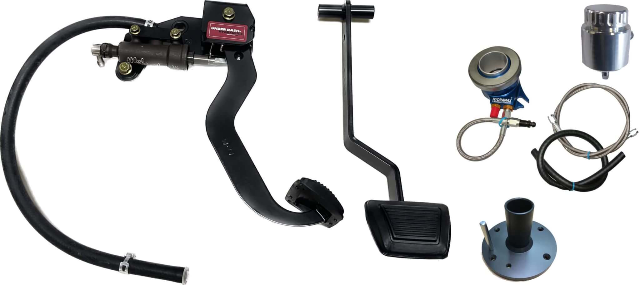 Underdash Hydraulic Clutch Conversion kit for 1971-74 Mopar B-body (Charger, Road Runner, GTX and Coronet). Completely bolt in kit with Malwood integrated master cylinder that mounts under the dash. Takes all the guesswork out of mounting and pedal rod ratio. Includes Hydramax Hydraulic Bearing for Tremec Magnum 6-Speed and T-56.