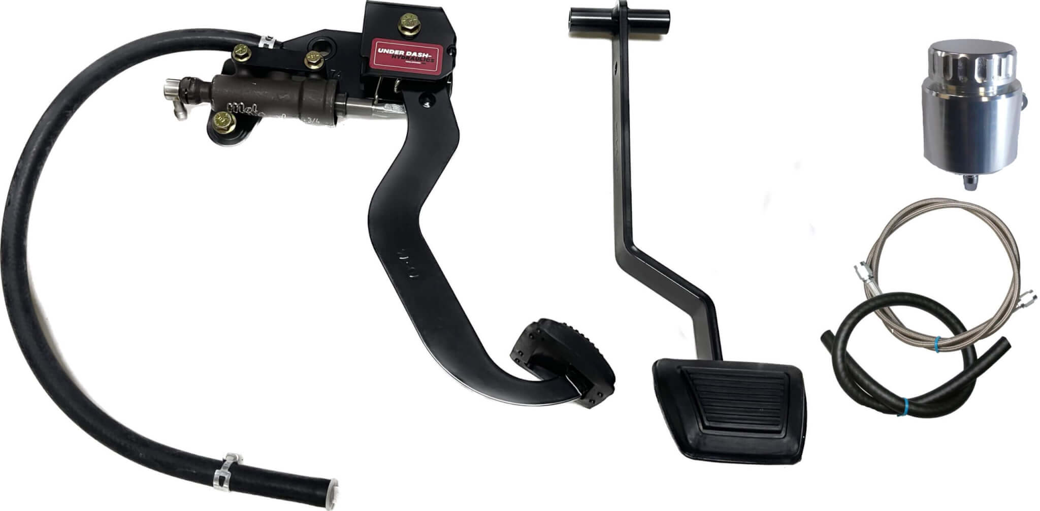 Underdash Hydraulic Clutch Conversion kit for 1971-74 Mopar B-body (Charger, Road Runner, GTX and Coronet). Completely bolt in kit with Malwood integrated master cylinder that mounts under the dash. Takes all the guesswork out of mounting and pedal rod ratio.